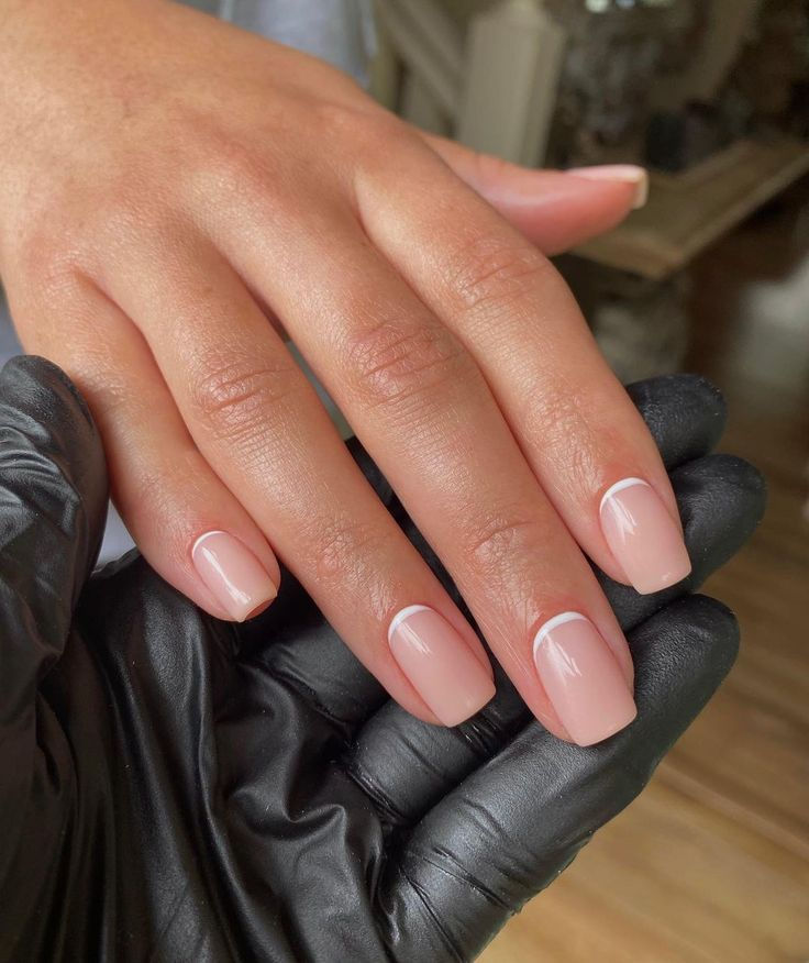Wil je een ultra-subtiele en elegante look? Kies dan voor bijna onzichtbare French tips. Een nude basis met een héél dun wit randje maakt je nagels optisch langer en super verzorgd – perfect als je korte nagels hebt.